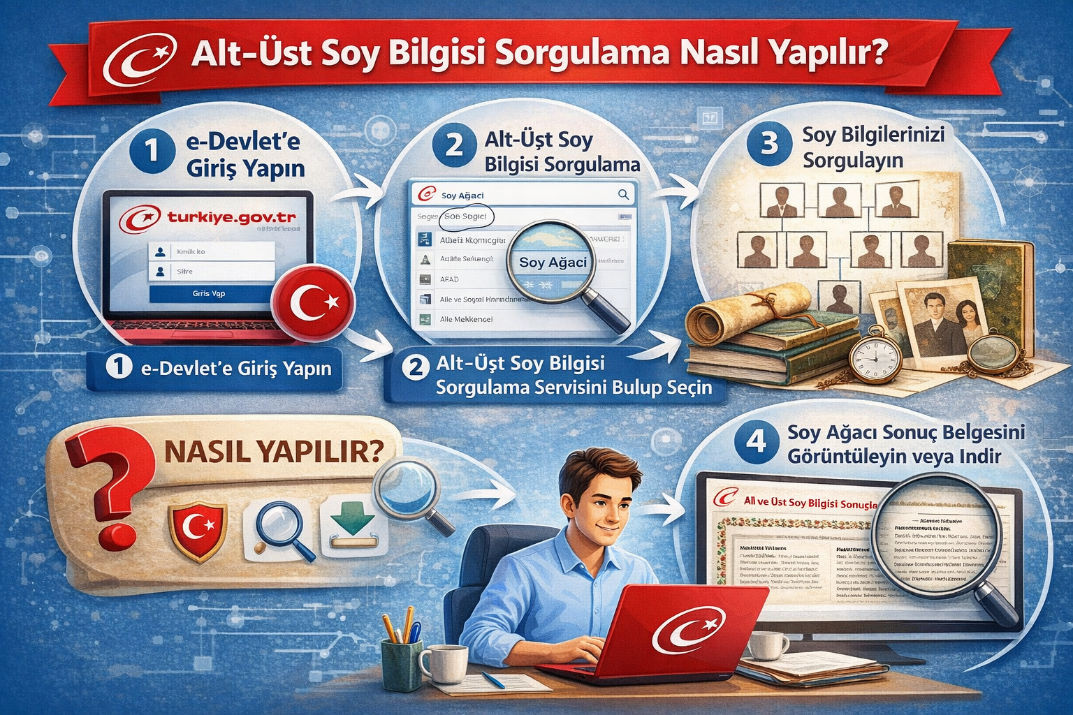Alt-üst soy bilgisi sorgulama işlemi, e-Devlet üzerinden kolayca yapılabilir. İşlem adımları şöyledir: