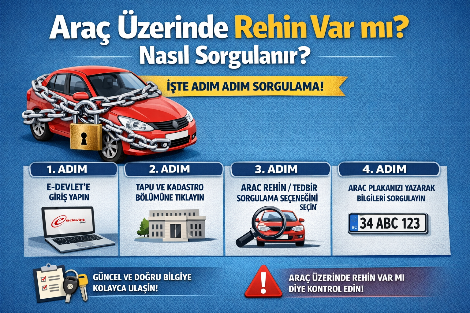 Araç üzerinde rehin olup olmadığını sorgulamak, ikinci el araç alım-satımında en önemli güvenlik adımlarından biridir. e-Devlet üzerinden birkaç dakika içinde yapacağınız sorgulama sayesinde hem maddi kayıpların hem de hukuki sorunların önüne geçebilirsiniz.