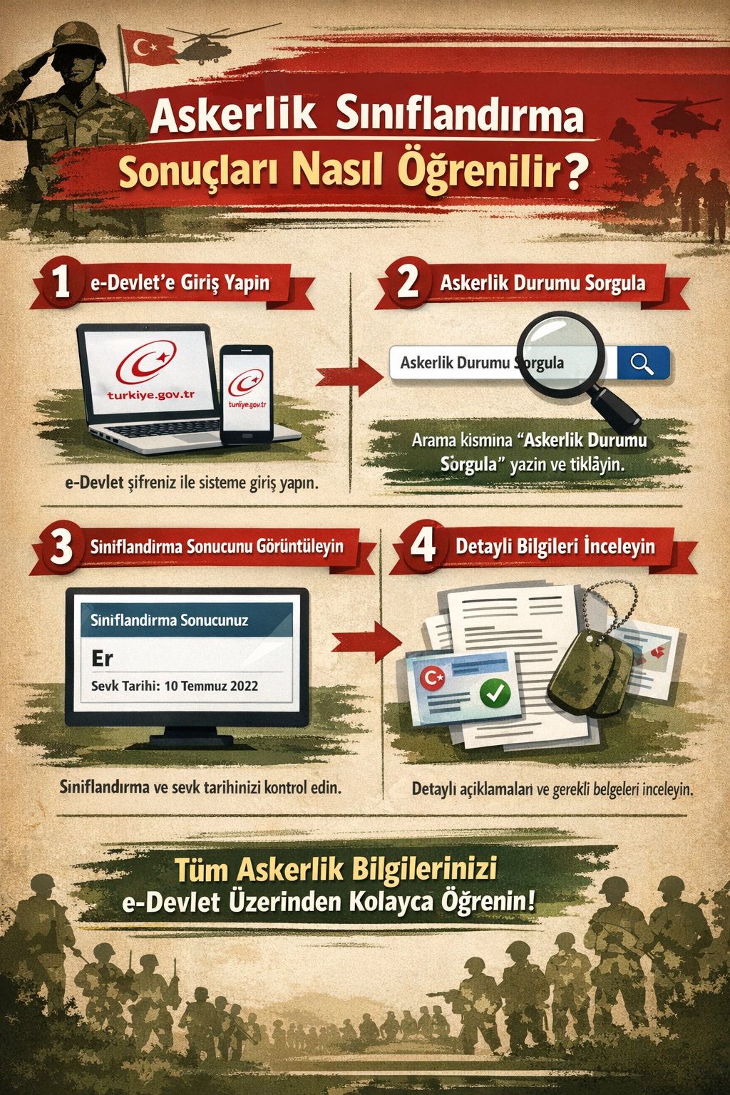 Askerlik sınıflandırma sonuçları, Türkiye’de erkek vatandaşların askerlik hizmeti açısından durumunu resmi olarak gösteren belgedir. Bu sonuçlar, askerliğe uygunluk, tecil, muafiyet veya bedelli askerlik hakkı gibi bilgileri içerir. 2026 yılı itibarıyla sınıflandırma sonuçları e-Devlet, askerlik şubeleri ve Milli Savunma Bakanlığı sistemi üzerinden öğrenilebilmektedir.